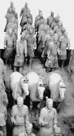 ...В марте 1974 года деревенские жители китайской провинции Шаньси в полутора километрах от города Сиань рыли колодец и случайно наткнулись на туннель. Так было сделано сенсационное мировое открытие – циньская монументальная скульптура. Во время раскопок могилы императора Цинь Ши-хуанди обнаружили целое глиняное войско из более чем 6000 всадников и пехотинцев, выполненных в натуральную величину. Этот холм полностью еще не раскопан, но рассказывают, что это громадный подземный дворец со сказочными сокровищами.