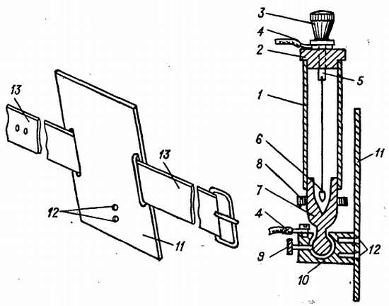 Замыкателем служит гирька в виде шарика или конуса (лучше всего, если она сделана из посеребренного металла). Нижняя ввинчивающаяся пробка 7 вытачивается на токарном станке, причем пятка (нижняя часть пробки) должна иметь шаровидную форму для крепления в штативе. Сверху в пробке 7 вытачивается конус, а снаружи нарезается резьба для ввинчивания в цилиндр. Ввинчивая пробку на различную глубину, можно регулировать зазор между маятником и стенкой конусного отверстия пробки.