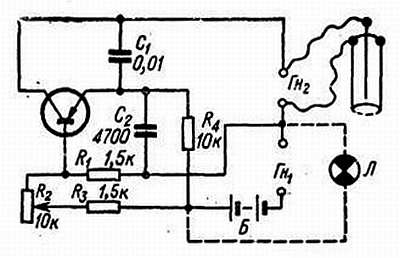 К гнездам Гн1 подключается контактная цепь гравитационного маятника, а к гнездам выхода звукового генератора Гн2 — капсула от слухового аппарата или головные телефоны.