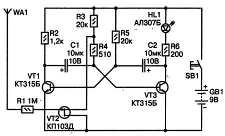 Как только замкнутся контакты выключателя SB1 и на схему будет подано питание, мультивибратор начнет работать, а транзисторы — поочередно отпираться, что приведет к частым вспышкам светодиода HL1. Транзистор VT2 при этом заперт. Стоит приблизить щуп WA1 к электрическому проводу, вокруг которого имеется электрическое поле, — как транзистор VT2 откроется и через низкоомный резистор R4 замкнет цепь базы VT3 на минус. В результате колебания мультивибратора будут сорваны, и светодиод погаснет. Питание на схему напряжением 9 В подается от батареи «Крона» или «Корунд».