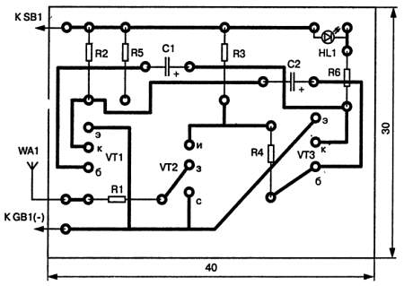 Все детали искателя кроме щупа размещаются на печатной плате (рис. 11).