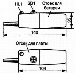 Устройство помещается в пластмассовый корпус, показанный на рис. 12, который можно склеить из молочного оргстекла. Такая миниатюрная конструкция позволяет носить искатель в кармане.