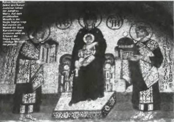 Храм святой Софии. Мозаика, изображающая императоров Константина (слева) и Юстина, приносящих дары Деве Марии