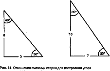 Система проще некуда. Необходимо лишь знать, какие отношения дают требуемые углы, например, в случае уже описанного треугольника древним землемерам следовало лишь помнить отношение 6:5. Оно дает углы в 39,81° и 50,19°, что весьма близко к 40° и 50° (рис. 61).