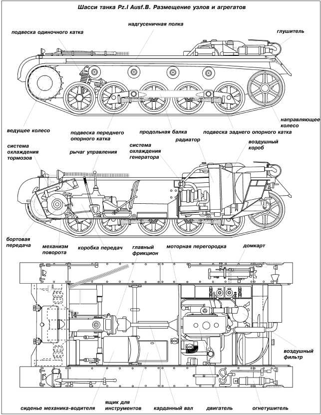 ХОДОВАЯ ЧАСТЬ танка Pz.I Ausf.A применительно к одному борту состояла из четырех обрезиненных опорных катков диаметром 530 мм и одного необрезиненного опорного катка несколько большего диаметра, выполнявшего роль ленивца. Передний каток имел индивидуальную подвеску на спиральной пружине, остальные были сблокированы попарно на продольной внешней балке и подвешены на листовых четвертьэллиптических рессорах. Поскольку корпус Pz.I Ausf.B был длиннее на 400 мм, в ходовую часть добавили пятый опорный каток, а ленивец подняли с грунта. Число поддерживающих катков колебалось от трех (Pz.IA) до четырех (Pz.IB). Ведущее колесо переднего расположения. Гусеница мелкозвенчатая, двухгребневая, шириной 280 мм.