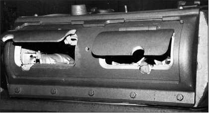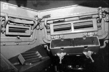 Интерьер башни танка Pz.I Ausf.A. Слева — механизм поворота башни; справа, под амбразурами и рамкой для крепления пулеметов, — короб для пулеметных магазинов (фото вверху). Хорошо различима система открывания смотровых лючков. В коробке под сдвоенным прибором наблюдения механика-водителя устанавливались стеклоблоки триплекс (фото внизу).