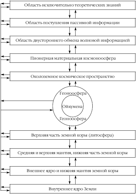 Локализация населения в населенных пунктах, городах, агломерациях и мегалополисах приводит к аккумулированию социомассы, информации и энергии, делает их ядрами социально–географических полей, вокруг которых формируется тяготеющая к ним периферия. В местах наименьшего тяготения наблюдается пониженный массо–и энергообмен, что учитывается при проведении условных границ полей. Эти границы носят прозрачный и расплывчатый характер и поэтому не препятствуют протеканию ноосферных, социальных, экономических, энергетических, информационных и других процессов. Между полями существуют мощные силы притяжения и отталкивания, которые формируют массовые материальные, духовные, политические и коммуникационные взаимосвязи. Разнообразные и интенсивные энерговещественные потоки пронизывают социально–географическое пространство и взаимодействуют с геологическим и космическим пространствами. Эти взаимодействия обусловлены проникновением человека как в литосферу (шахты, карьеры, буровые скважины и др.), так и в космос. Одновременно геологическое и космическое пространства изменяют параметры и свойства территориальных общественных систем, непрерывно обеспечивая их «средствами к существованию» – веществом, энергией, информацией. По степени, характеру и интенсивности этого взаимодействия в ноосфере выделяются следующие структурные уровни, или области (рис. 3.1).