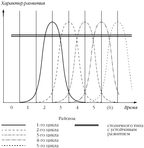Рис. 3.2. Динамика районов разного типа в ходе больших социально–географических циклов Н. Д. Кондратьева (по В. Л. Бабурину)