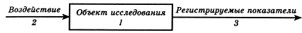 Рис. 12. Принципиальная схема любого (?) эксперимента. Ясное представление о ней позволит выбрать правильную последовательность изложения результатов исследования – по воздействовавшим факторам (2) – болезням, лекарственным препаратам, условиям внешней среды и т. п., а не по объектам исследования (1) и тем более не по регистрируемым показателям (3)