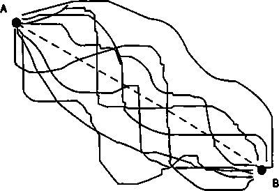 Рис. 17.6. Путь частицы от точки А к точке В. Чтобы найти самую короткую траекторию, частица проверяет все возможные пути. Волна, связанная с частицей, разрушительно интерферирует с любой другой, за исключением прямой линии (пунктир), соединяющей А и В. Согласно квантовой теории, частицу можно найти с наибольшей (но не 100 %-ной) вероятностью именно на этой линии.