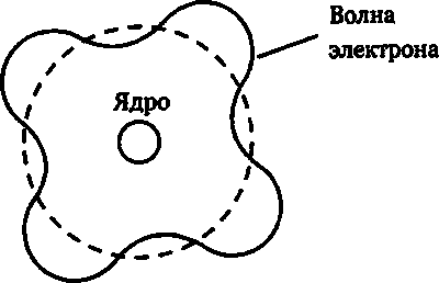 Рис. 17.4. Волны электронов, циркулирующие вокруг атомного ядра. Если на одном обороте укладывается целое число волн, то волна усиливается и возникает разрешенная электронная орбита. Если фазы волны после одного оборота не совпадают, интерференция приводит к их затуханию. Поэтому в модели Бора такой орбитальный радиус невозможен.