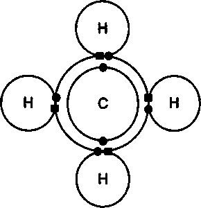Рис. 17.5. Схема ковалентных связей в молекуле метана. Ядра показаны символами элементов С и H, а электронные оболочки — кругами. Электроны показаны темными кружочками (углерод) и темными квадратами (водород). Каждый из четырех атомов водорода делит свой электрон с углеродом для образования ковалентной связи и создания молекулы метана. Заметим, что в результате все оболочки заполнены: два электрона на внутренней оболочке и восемь электронов на внешней.
