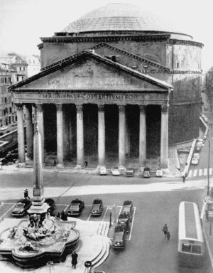 Снаружи Пантеон представляет собой глухое кольцо цилиндра. Раньше перед ним находилась обширная площадь, так необходимая всем римским постройкам. Площадь эта символизировала открытое пространство и шум жизни под южным небом – идеал старой римской общины. Когда же община переросла в мировую империю, идеал переместился снаружи внутрь.