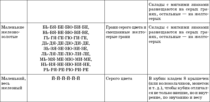 В «золотые» кубики можно положить любой звенящий наполнитель из описанных выше. Но звук, который издают «золотые» кубики, должен отличаться от кубиков «железных». Поэтому для «железных» и для «золотых» кубиков нужно подобрать два разных наполнителя.