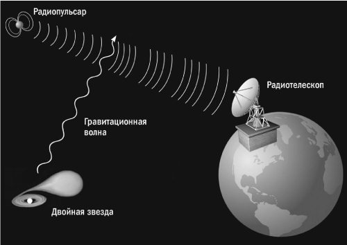 Астрофизики предлагают все новые способы «поймать» гравитационное излучение. На помощь призваны радиопульсары как источники импульсов строго постоянной частоты. Идея проста. Представьте себе, что где-то на пути от пульсара к Земле находится источник гравитационного излучения, например тесная двойная звезда. Тогда свойства пространства в этой области не остаются неизменными, ведь гравитационная волна – это и есть периодическое изменение свойств пространства-времени! Радиосигналу пульсара понадобится то чуть больше, то чуть меньше времени, чтобы достичь Земли.