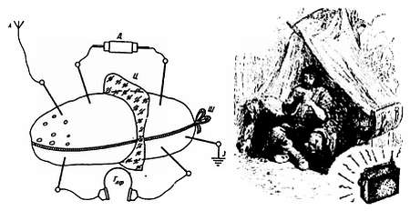 Он разрезал картофелину пополам, оторвал от сигарет целлофановую пленку Ц и вставил ее между половинками. Затем шнурком Ш от ботинок связал картофелину. Воткнул в нее диод Д из проволоки сделал антенну А, затем заземление 3. Приспособил телефоны Тлф, и вот, что-то зашипело и заговорило. Забросил антенну повыше, заземление воткнул в песок, омываемый водой, так как радиатора парового отопления рядом не оказалось. Попытался поменять положения контактов, удовлетворил свое любопытство и заснул, а когда проснулся, картофелины не нашел.