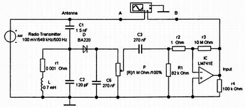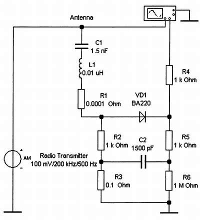 Радиостанцию (Radio Transmitter), которую собирается «поймать» Робинзон, смоделируем специальным амплитудномодулированным источником AM Source со следующими характеристиками: частота несущей взята условно — 200 кГц; частота модуляции — 500 Гц; глубина модуляции — 100 %; напряжение, развиваемое на антенне, — 100 мВ (все цифры взяты условно для удобства моделирования). Задавшись примерными параметрами устройства, получим схему, представленную на рис. 77.
