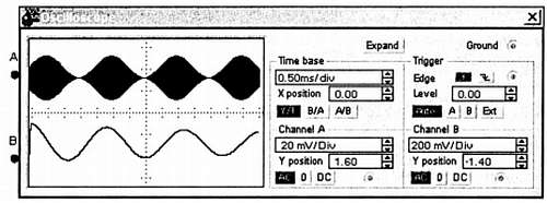 Для наблюдения результата используем двухканальный виртуальный осциллоскоп (вот бы его, да Робинзону!). Выполнив соответствующие установки режимов развертки, получаем картину (см. рис. 78) амплитудно-модулированных колебаний (канал — А) и частично «отдетектированного» сигнала (канал — В).