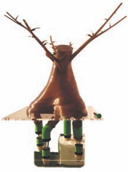 У растений процесс роста и движения корней обеспечивается двумя механизмами: делением клеток меристематических тканей[4] в зоне деления на конце корня и распуханием клеток в задней части корня, так и именуемой – зоной роста. Оба эти механизма мы попытались воспроизвести в конструкции наших искусственных корней с помощью резервуара для пластика, который использовался для постоянного наращивания автоматического корня. Кроме того, стремясь воспроизвести разнообразные способности природного корня, мы снабдили наш автоматический корень акселерометром для надежного определения направления приложения силы тяжести; датчиком влажности, чтобы воспроизвести способность растения чувствовать малейшие изменения гидрорежима; несколькими химическими сенсорами; осмотическими преобразователями (устройствами, преобразовывающими осмотическое давление в движение), которые обеспечивали сохранение направления и проникновение в почву. Робот-корень был снабжен микроконтроллером, который обрабатывал информацию, поступающую от различных сенсорных устройств и создавал подобие распределенного интеллекта, свойственного растительным корневым системам. Когда мы наконец сконструировали корни аппарата, пришлось заняться листьями. Эта задача была менее сложной, и ее удалось решить с помощью фотоэлементов, которые имитировали процесс фотосинтеза и снабжали наш аппарат энергией, необходимой для выполнения всех оперативных функций.