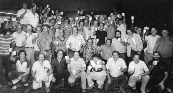 Команда Skunk Works празднует первый успешный испытательный полет малозаметного истребителя 18 июня 1981 года. Бен Рич шестой справа в третьем ряду (слева от человека в тёмной футболке).(Фото Skunk Works)