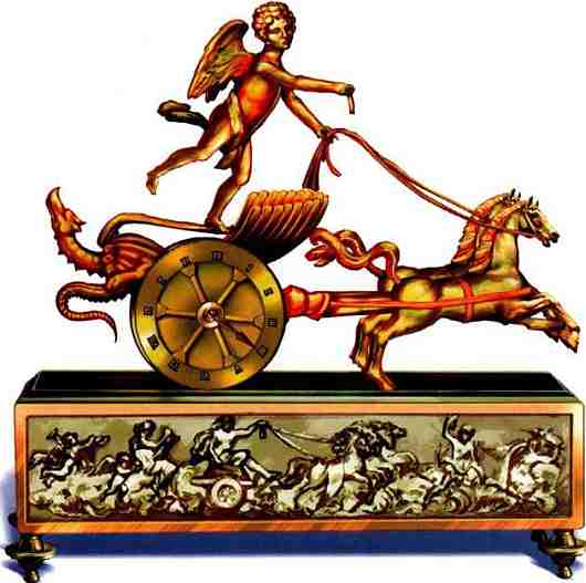 Каминные часы в виде колесницы. Ее колесо служит корпусом часов и циферблатом