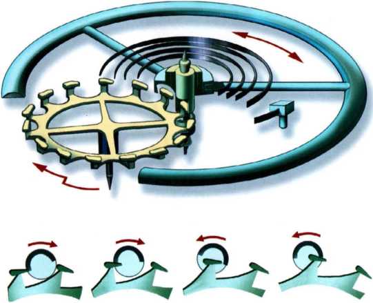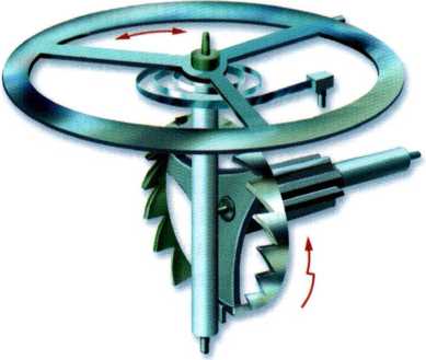 Под действием пружинистого волоска маховичок, баланс, подобно маятнику, колебался, поворачиваясь то в одну, то в другую сторону. За один час он совершал более 20 тысяч колебаний. А вместе с балансом поворачивался и шпиндель с палетами.