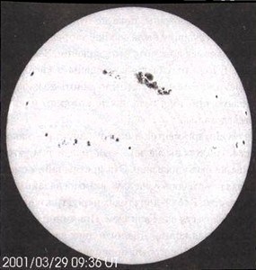 Рис. 7.3. Галилей был одним из первых, кто заметил пятна на Солнце. Это современное фото показывает группу огромных пятен, наблюдавшихся на Солнце в 2001 году. Солнечные пятна — это временные образования: одни пятна со временем исчезают, другие появляются. Теперь мы знаем, что причиной появления пятен служат сильные магнитные поля, выходящие из внутренних областей Солнца. Пятна кажутся темными, потому что они немного холоднее окружающей поверхности.