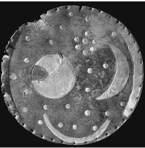 Рис. 1.1. Неолитическая «карта» звездного неба, включающая изображение Плеяд, изготовленная из бронзы с золотыми накладками. Найдена в Германии, близ г. Небра, в 1999 г.