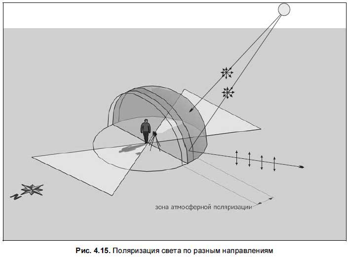 Свет от солнца, который приходит в земную атмосферу, не поляризован, поэтому, когда вы будете снимать без поляризационного фильтра, направляя объектив в сторону солнца, то на большинстве фотографий небо будет получаться «белесым» (рис. 4.15). Но на частицах атмосферы свет частично поляризуется, и если вы будете располагать объектив под прямым углом к оси направления на солнце, в таком положении небо будет на фотоснимках голубое. На рисунке данная область обозначена как «зона атмосферной поляризации». Это достаточно узкая полоса. Посмотрите на рис. 4.16, как видите, там размещена машина, над машиной будет голубое небо. В остальных случаях целесообразно применение поляризационного фильтра.