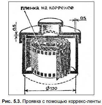 Затем рулон кладут в подходящую по размерам фаянсовую, фарфоровую или эмалированную кружку. Проявление и фиксирование ведут в полной темноте, так же, как и в случае фотографического бачка. Под бачок для коррекса можно приспособить консервную банку из-под кофе с черной крышкой. К крышке можно даже приделать несложный клапан для залива реактивов, воронку для реактивов можно сделать, отрезав донышко у пластиковой бутылки подходящего размера. Да и саму коррекс-ленту при необходимости можно изготовить из подручных материалов, для этого с ненужной пленки горячей водой смывают эмульсию, а в отверстия перфорации продевают толстую леску, сложенную вдвое.