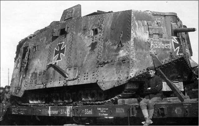 Танк A7V Adalbert из состава 3-го штурмового отделения во время перевозки по железной дороге. 1918 год.