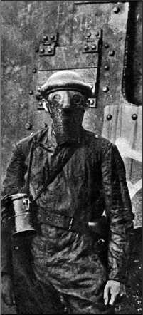 Немецкий танкист в шлеме и защитной маске позирует на фоне своего A7V.