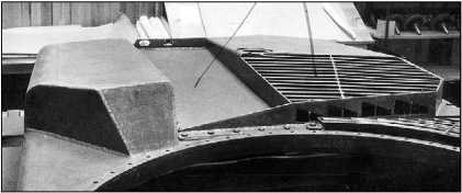 Вид спереди на даймлеровский «грострактор». В носовой части размещался прожектор, закрытый броневым кожухом (фото вверху). Крыша моторно-трансмиссионного отделения, вид в корму (фото внизу).