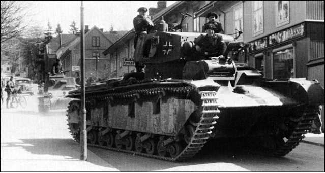 Многобашенный танк Nb.Fz. на улицах Осло. Апрель 1940 года. Следующий за Nb.Fz. командирский kl.Pz.Bf.Wg. кажется на его фоне лилипутом.