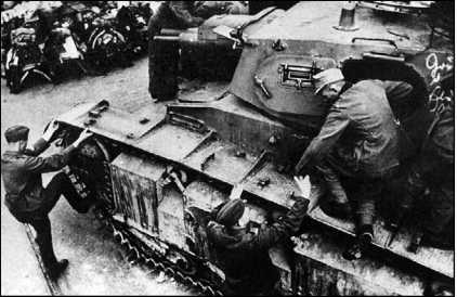 Экипаж занимает места в танке Nb.Fz. Дверцы в бортах башни были отличительной особенностью немецких средних и тяжелых танков 1930-х годов.