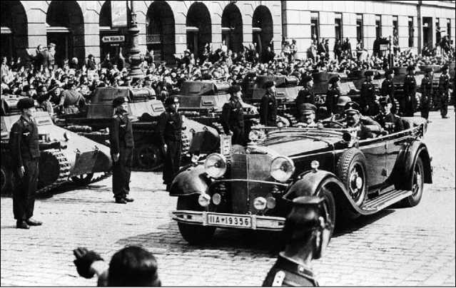 Гитлер проезжает в автомобиле мимо строя танков и их экипажей вновь сформированной танковой части. Судя по форме танкистов, этот снимок сделан после мая 1936 года.