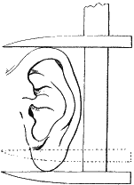 а) Наибольшая длина его — между самым верхним краем завитка (helix) и нижним краем мочки (см. рис. 9, сплошная линия), не нажимая ножки циркуля на измеряемые точки.