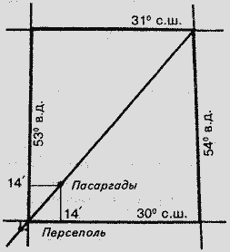 История Ахеменидской державы персов хорошо известна. Но вот что странно: город Пасаргады построен в укромной области обитания персов, совсем не подходящем для столицы великой империи, в среднем течении реки Польвар. Чрезвычайно интересны координаты этого места: 53°14' в.д.; 30°14' с.ш.