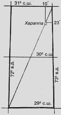 И этот город стоит на диагонали полуквадрата, на левом берегу реки Рави (рис. 143). Время существования Хараппы XXXIII-XV в. до н.э. Начало строительства совпадает с эпохой Страны Городов на Южном Урале, Мегалитической Культурой Британии и Архаическим периодом Древнего Египта. Археологи установили, что ранние индоарии контактировали с позднехараппским населением, следовательно, могли знать, что священный квадрат занят дееспособной цивилизацией, жречество которой осведомлено о истинной природе сакральных центров. Вероятно, сила в таком деликатном деле роли не играет, а потому пришельцы отошли на восток и заняли долины Индо-Джамнского междуречья. Ариаварта расположена в бассейне реки Сарасвати, в геодезическом полуквадрате между 76° в.д., 77° в.д. и 29° с.ш., 31° с.ш.