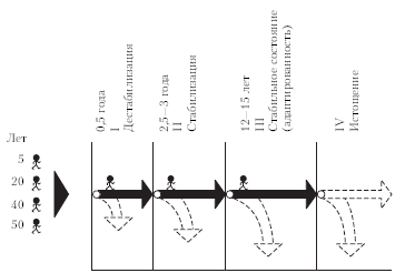 Большинство исследований, посвященных проблеме адаптации, касаются в основном механизмов приспособления людей, недавно попавших в измененные условия среды. Данных об особенностях адаптационных процессов у длительно проживающих в этих условиях гораздо меньше. В связи с этим трудно судить о динамике адаптационного процесса в онтогенезе. Немногие сведения, которые имеются по данной проблеме, свидетельствуют о том, что при переезде человека в неблагоприятные условия жизни на одно, два и более десятилетий, у него происходят длительные циклические изменения в организме (рис. 1.7).