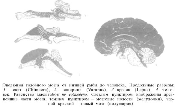Важнейшая определяющая черта неокинетических животных[23] (как мы теперь будем называть обладателей поперечнополосатой мускулатуры) — центральная нервная система и головной мозг начали впервые с известной четкостью определяться уже у высших моллюсков (например, у головоногих — осьминога, каракатицы.) Однако только у позвоночных они нашли условия для бурного и безостановочного развития, продолжающегося и поныне. Это развитие, некоторые подробности которого будут освещены дальше, повело в конце концов к тому, что головной мозг, и в частности самая новая его часть, так называемая кора больших полушарий, завладел у высших позвоночных верховной диктатурой по всем решительно физиологическим отправлениям. Это — новая, только в последние годы приоткрываемая страница науки о мозге; высокие заслуги в ее открытии принадлежат крупнейшему русскому физиологу К. М. Быкову. Год от года выявляется все больше и больше сторон жизнедеятельности, на которые головной мозг простирает свое верховное влияние: обмен веществ, управление физико-химическими процессами в крови, кроветворение, борьба с заразными началами и т. д., и т. д. Как бесконечно далеко это от тех невзрачных волоконец, едва начавших обособляться от окружающей ткани, по которым пробивал себе дорогу первобытный электрохимический возбудительный импульс!