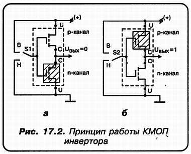 «Н»: А если на рис. 17.2, б S2 перевести в противоположное положение, то р-канальный и n-канальный транзисторы, я полагаю, просто поменяются ролями!
