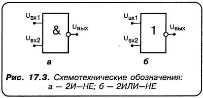 «А»: Точно так! Во всех схемах логики (или цифровых схемах малого уровня интеграции) приняты следующие обозначения. Прямоугольник с выводами, изображенный на рис. 17.3, а, читается как 2И-НЕ, а изображенный на рис. 17.3, б, как 2ИЛИ-НЕ. Означает это тот факт, что уровень логического «0» на выходе (рис. 17.3, а) будет в том случае, если на ОБОИХ входах будет присутствовать уровень логической «1». Что касается элемента, изображенного на рис. 17.3, б то уровень логической «1» будет присутствовать на его выходе в случае, если ИЛИ на первом, ИЛИ на втором входах будет иметь место уровень логического «0». Понятно?