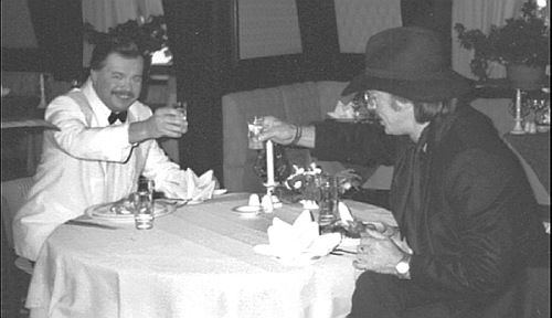 Однако его изощренный ум жаждал реванша. Тогда он попросил официанта принести две рюмки. Бедняга! Он не знал, что режиссер строго-настрого запретил во время съемок подливать в стакан ведущему настоящий алкоголь. Однако запрет не распространялся на гостя. Но в этот раз официант перепутал и принес две рюмки... воды. Надо было видеть лицо гостя, когда он залпом опрокинул воду в рот! Осознав подвох, он через пару минут громко потребовал еще водки. Настоящей. Официант посмотрел на режиссера, тот ему подмигнул. Официант принес две рюмки – одну с водкой, другую с водой. Первая досталась гостю в шляпе, вторая – ведущему. В течение съемок операция повторялась несколько раз, и гость никак не мог понять: почему ведущий так связно говорит и точно формулирует вопросы.