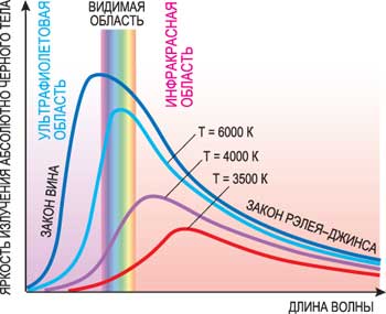Распределение интенсивности излучения в спектре абсолютно черного тела. Если в видимой области отношение яркости звезды и планеты достигает десятков миллиардов, то в области Рэлея-Джинса - всего около ста.
