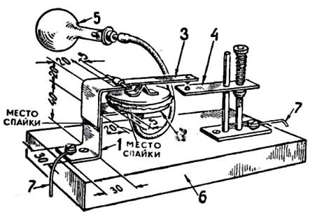 Контактным рычажком (3) может служить пластинка от старых телефонных реле с впрессованным в нее штифтом из тугоплавкого материала. Длина рычажка около 60–70 мм.