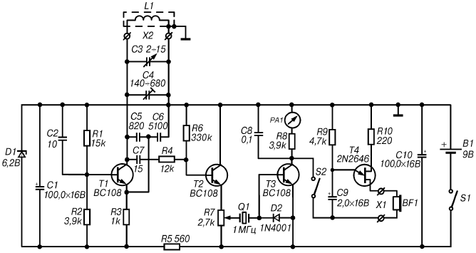 Колебательный контур генератора высокой частоты, выполненного на транзисторе Т1, состоит из катушки L1 и конденсаторов С3-С6. Рабочая частота ВЧ-генератора зависит от девиации индуктивности поисковой катушки L1, а также от изменения емкостей подстроечного конденсатора С4 и регулировочного конденсатора С3. При отсутствии вблизи катушки L1 металлических предметов частота колебаний, возбуждаемых в ВЧ-генераторе, должна быть равна частоте кварцевого элемента Q1, то есть в данном случае – 1 МГц.