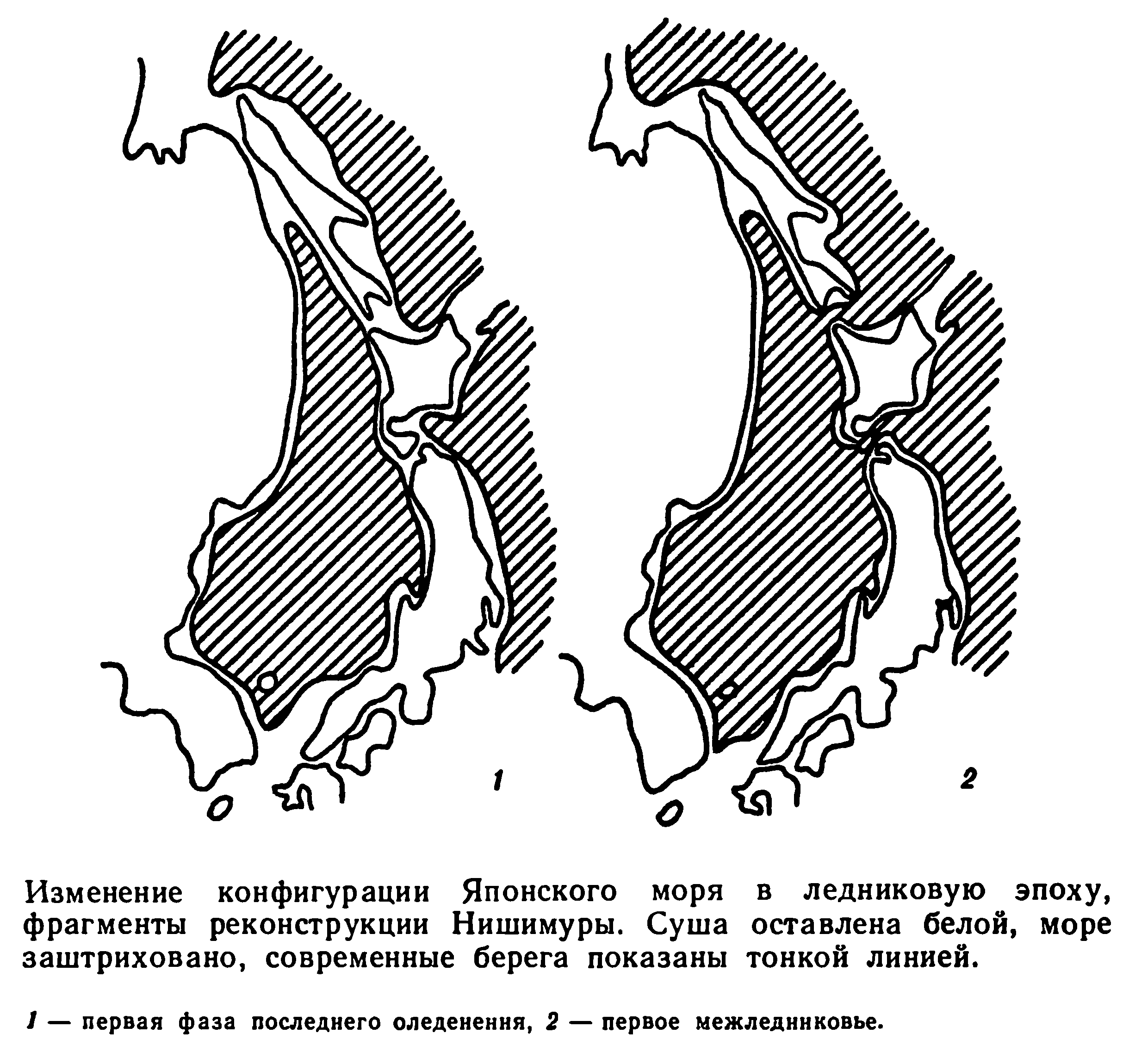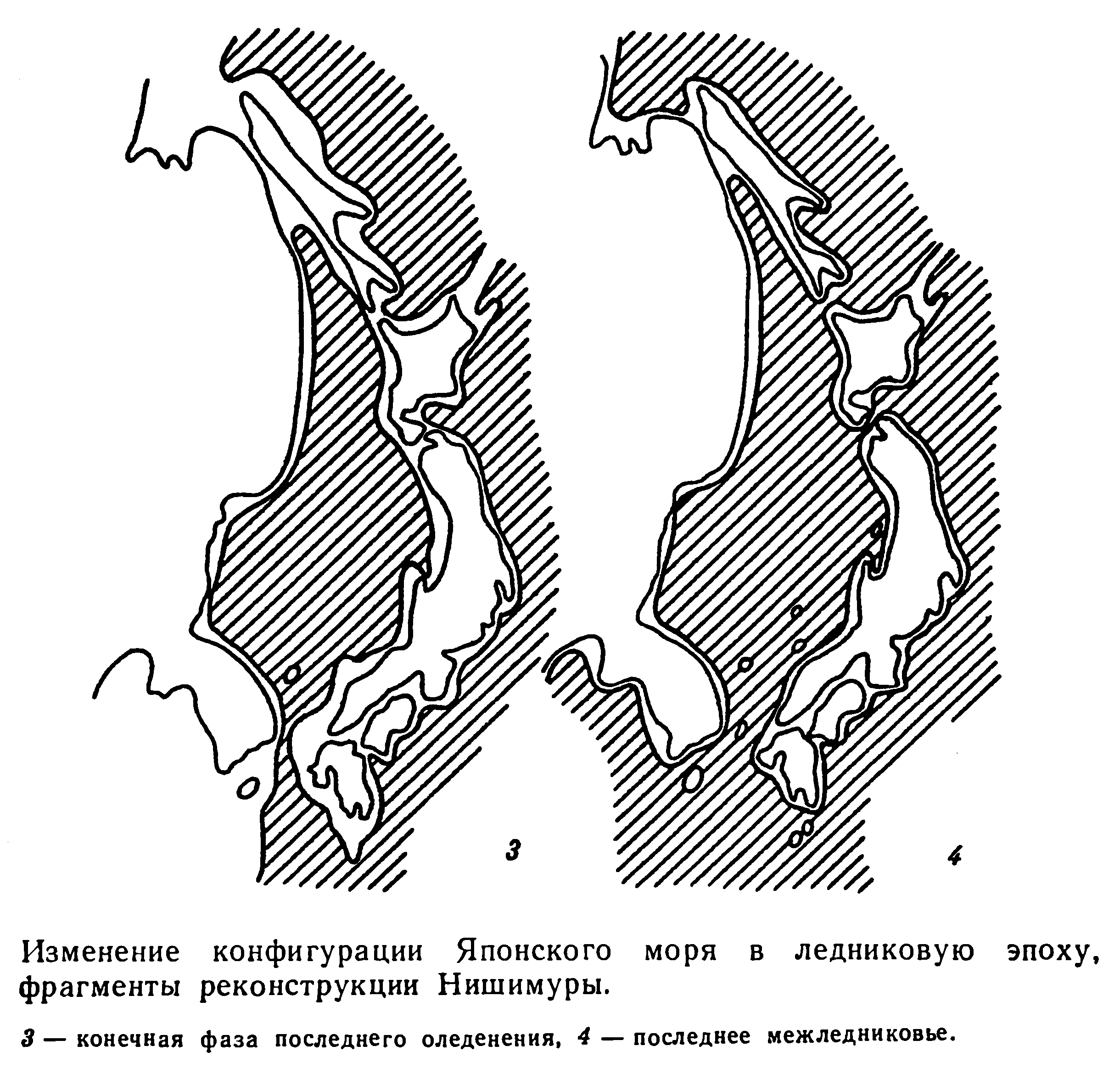 В статье «Происхождение Японского моря с точки зрения его фауны» японский зоогеограф Нишимура приводит несколько схем последовательного развития территории Японского моря и постепенного его превращения из пресноводного водоема в морской. Фазы развития моря он связывает как с тектоникой, так и с колебаниями уровня океана в результате оледенений. Причем даже в эпоху последнего оледенения, согласно Нишимуре, Японское море и контуры суши испытывали существенные изменения.