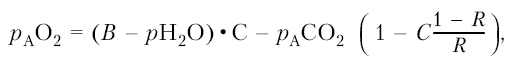 где раО2 – парциальное давление О2 в альвеолярном воздухе; В – барометрическое давление; рН2О – парциальное давление водяных паров в легких, которое зависит только от температуры, и при температуре тела 37 °C равно 47 мм рт. ст.; раСО2 – парциальное давление СО2 в альвеолярном воздухе; С – концентрация, процент содержания О2 в воздухе; R – дыхательный коэффициент.