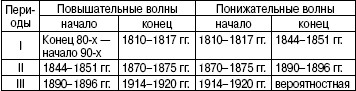Теория больших циклов Кондратьева, помимо анализа эмпирических данных, включала формулировку эмпирически установленных закономерностей длительных колебаний конъюнктуры и попытку теоретического объяснения этого явления. Согласно Кондратьеву, периоды больших циклов с конца XVIII в. включают периоды, указанные в таблице.